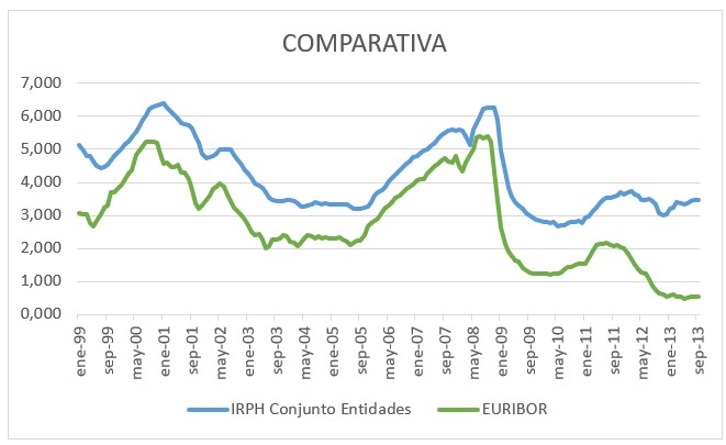 Esto se debe a la propia definición del IRPH, cuyo cálculo incluye diferenciales, comisiones y resto de gastos, al obtenerse a partir de las TAE, motivo que hace que el IRPH siempre haya sido mayor al Euribor, como se aprecia en el Gráfico: