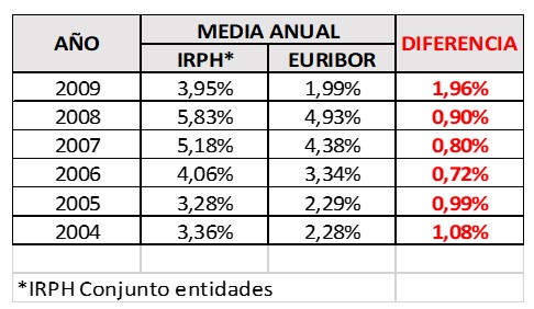 Hay una diferencia entre el Euribor y el IRPH de 0,90% entre 2004 y 2008, no se considera el ejercicio 2009 con el desplome de tipos por la crisis financiera.